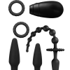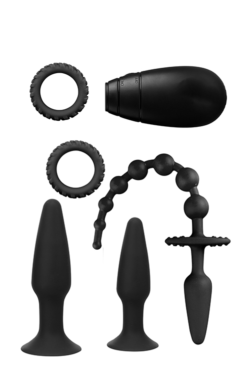 Anal kit containing 5 toys & remote control.1 Double ended anal plug (9cm) / bead (20cm).1 Vibrating anal plug (16cm) with multispeed controller. 1 Anal plug (13cm). 2 Penis rings (4cm).Batteries not included.A pleasure